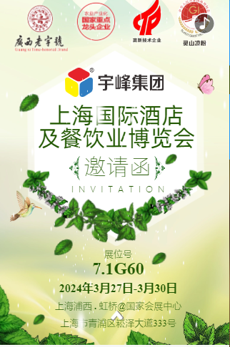 宇峰集團(tuán)上海國際酒店及餐飲業(yè)博覽會,展位:7.1G60,參展時間2024年3月27日—3月30日,上海國際會展中心我們等您哦!